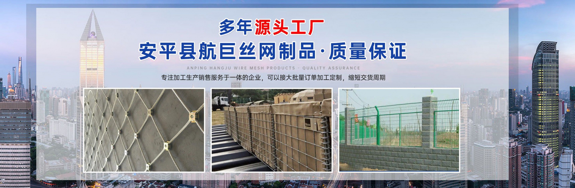 安平縣航巨絲網制品有限公司位于富有“絲網之鄉”美譽的—河北安平縣,此地是世界上最大的絲網集散基地,是華北平原上一顆璀璨的明珠。地處京、津、石三大城市中間,交通便利,是一家集生產,加工,銷售為一體的大型絲網廠家。本廠專業生產各種類型的絲網,類型齊全,主要包括:格賓石籠網,雷諾護墊,麥克排水墊,加筋麥克墊,市政護欄,防爆籠,主動防護網,被動防護網,電焊網片,鋼格柵板等產品,形成了針對邊坡支護、基坑支護、山體邊坡綠化、鐵路、高速、公路、江河、堤壩及海塘的防沖刷保護以及水庫、河流截流等不同行業、不同規模、不同應用的絲網產品和針對性解決方案,是國內最有影響力的絲網產品供應商。技術指標達到國家同類產品標準,可以接受較大的定單并保證質量和生產期限。  公司始終堅持誠信為本、質量第一、客戶至上的經營理念,本著互惠互利的精神,希望與國內外朋友共同合作,為您提供優質的產品和服務。我公司在創新管理中求發展、創新經營中求生存。把企業標準化管理、定額管理、計劃管理,公司十分注重把握市場經濟的信息脈絡,用現代網絡技術,以科研開發為原動力,與科技院校及相關專家密切合作,共同研制開發21世紀適用顧客需求的相關產品。  安平縣航巨絲網制品一直是以“質量精良,交貨及時,價格合理,服務周到”的宗旨來為廣大客戶服務;并且本著“質...